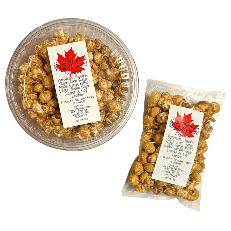 Ingredients: Popcorn, sugar, corn syrup, maple syrup, butter, water, brown sugar, coconut oil, soy lecithin Produced in the same facility as peanuts.